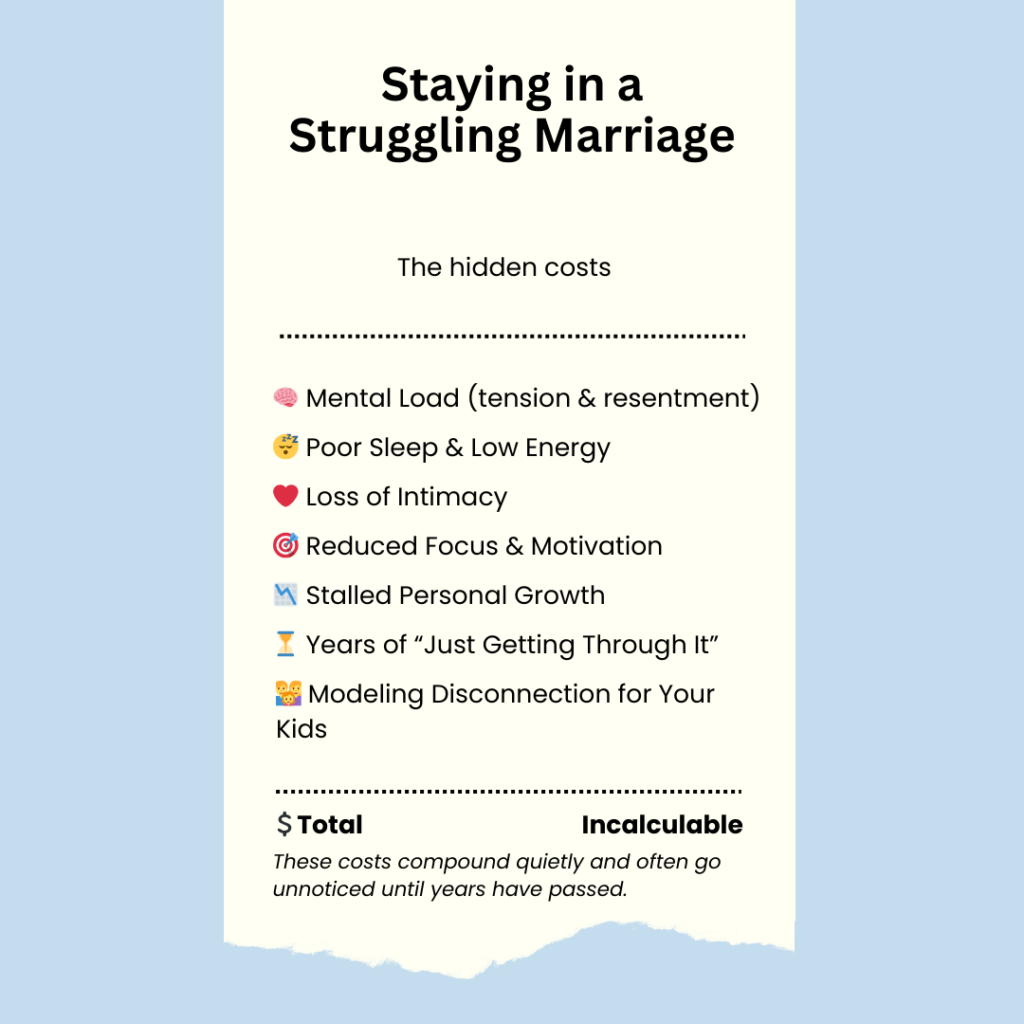 People in struggling marriages also tend to suffer from increased mental load, poor sleep, low energy, reduced focus, stalled personal growth and more.